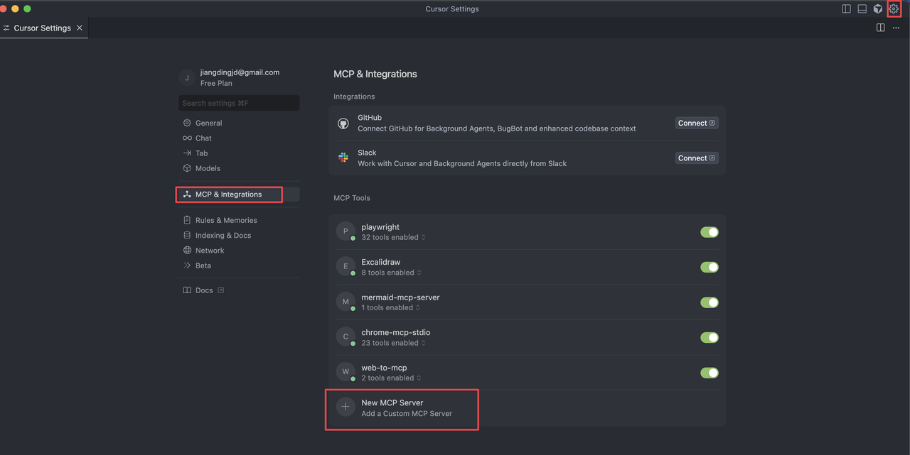 直接在Cursor打开右上角⚙️设置按钮,选择MCP配置