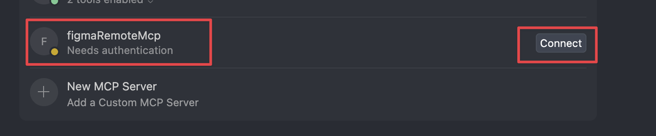 保存成功后,MCP Tools下会新增一个服务,点击右侧connect按钮打开Figma网站链接账户登录授权