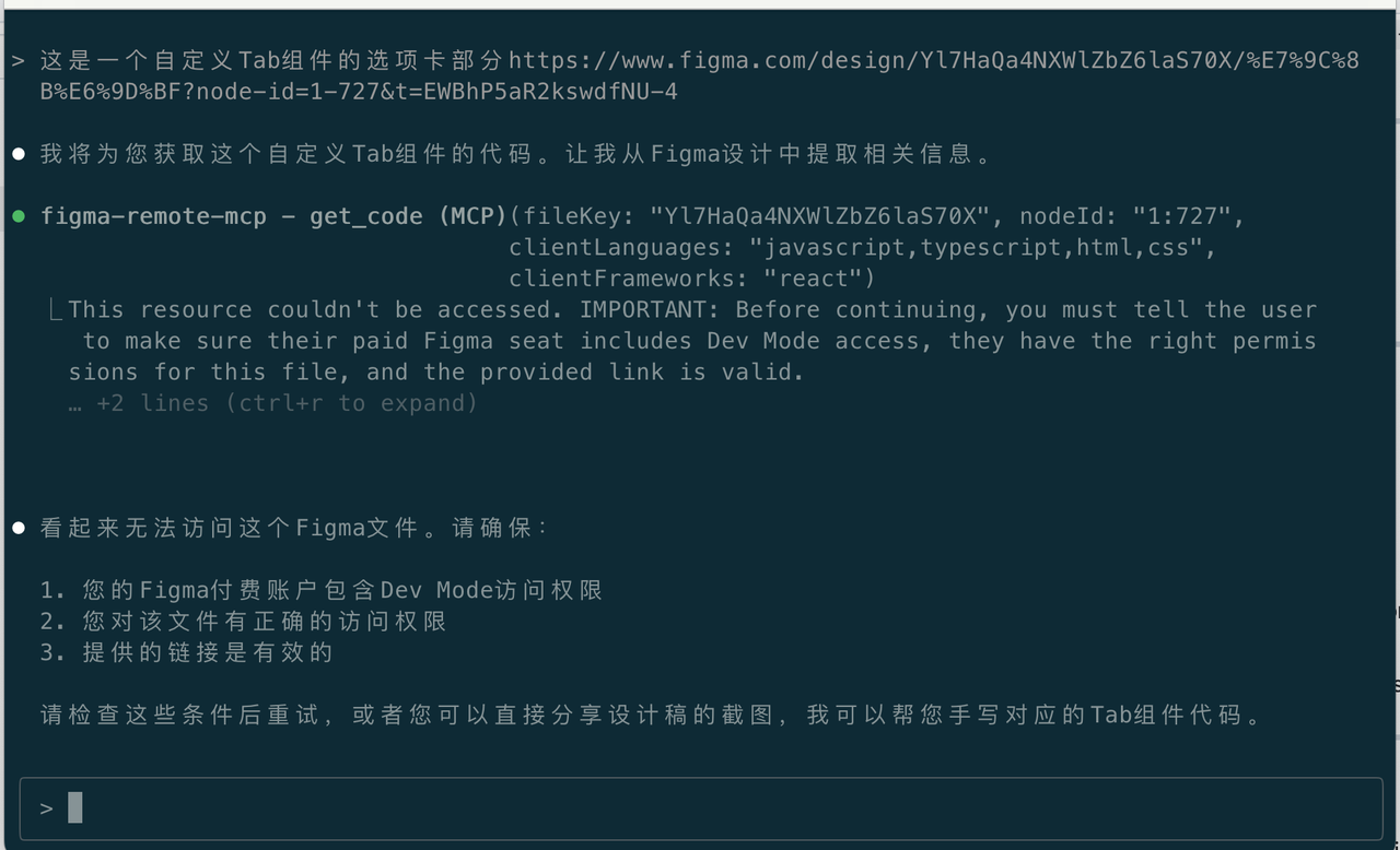 选择figma-remote-mcp工具,回车会跳转到Figma网站进行连接授权,同意后会显示连接成功