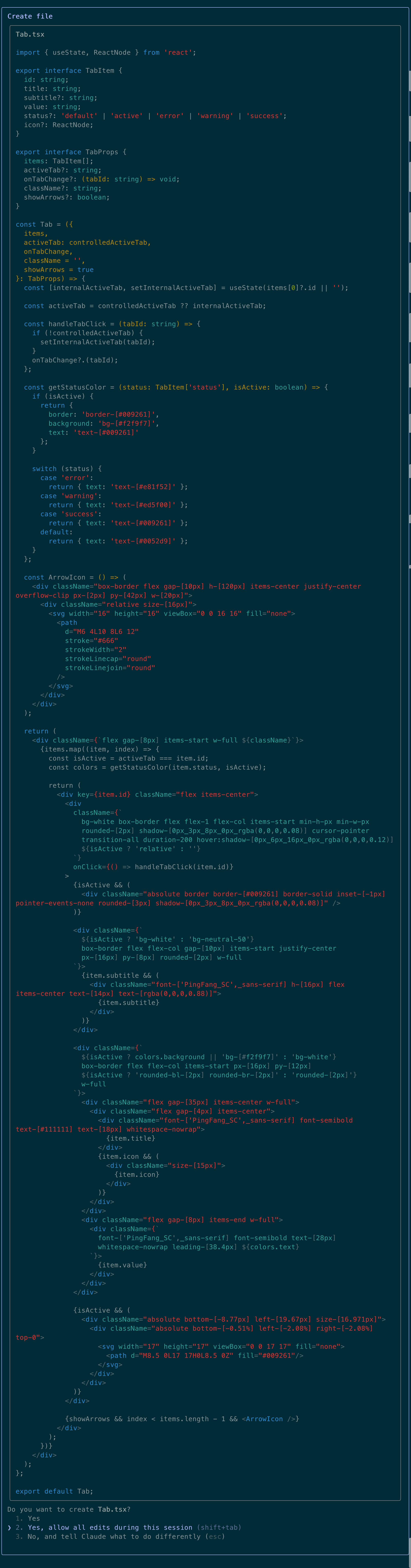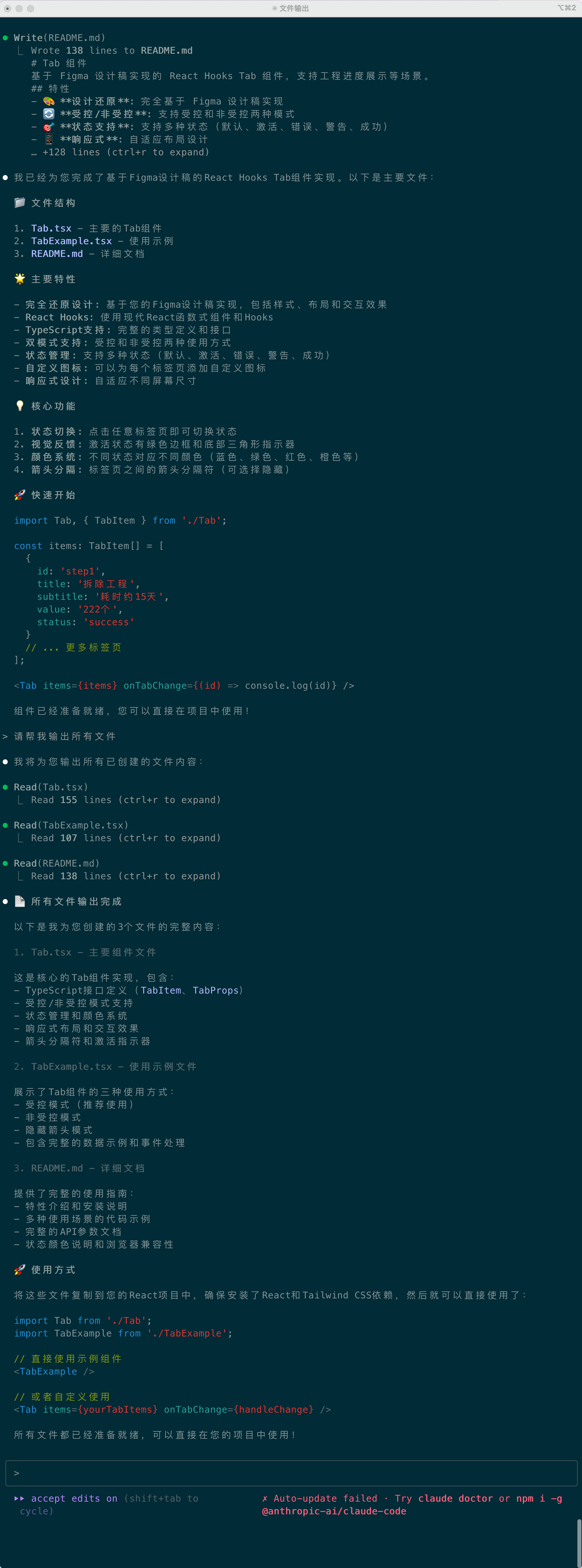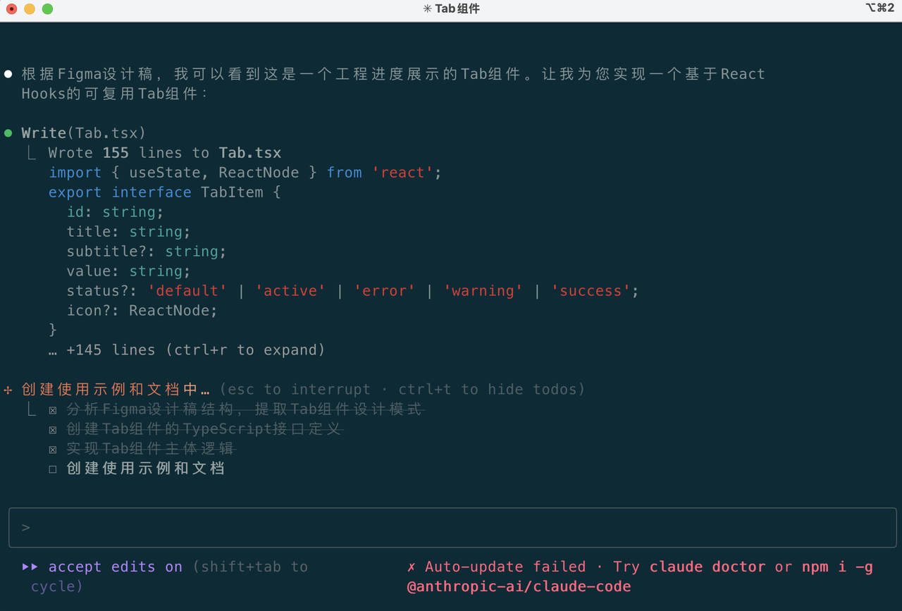 确认继续编辑之后,Claude Code又继续其他任务了,包括ts接口定义、实现组件主体逻辑以及创建使用示例文档等