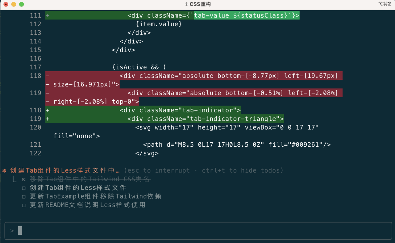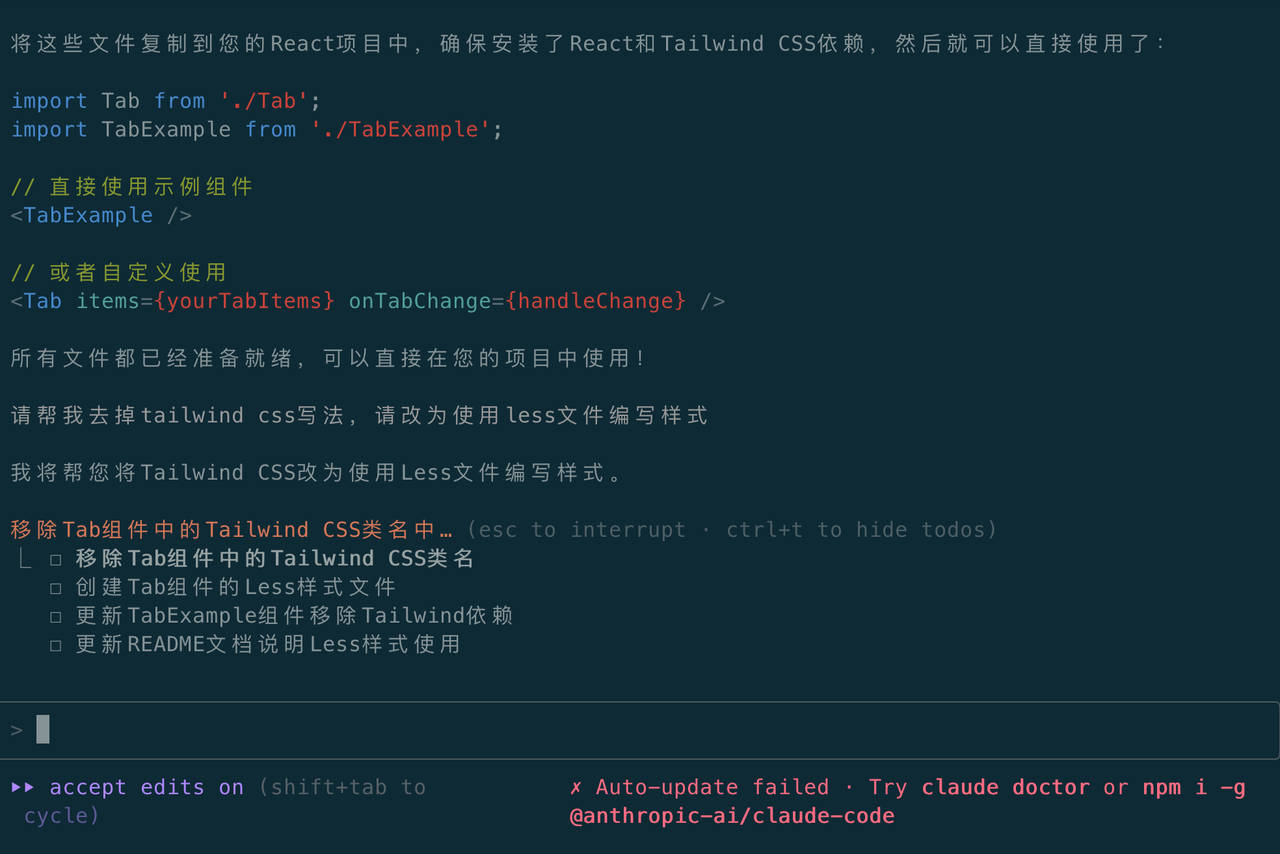 看了下代码,我发现组件样式是使用Tailwind风格实现的,我让他帮我改成单独的less文件,让Claude Code又重新开始了任务