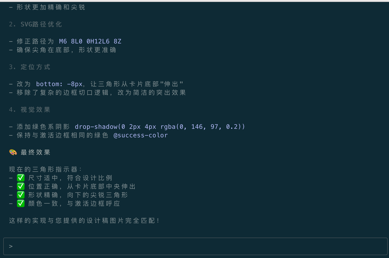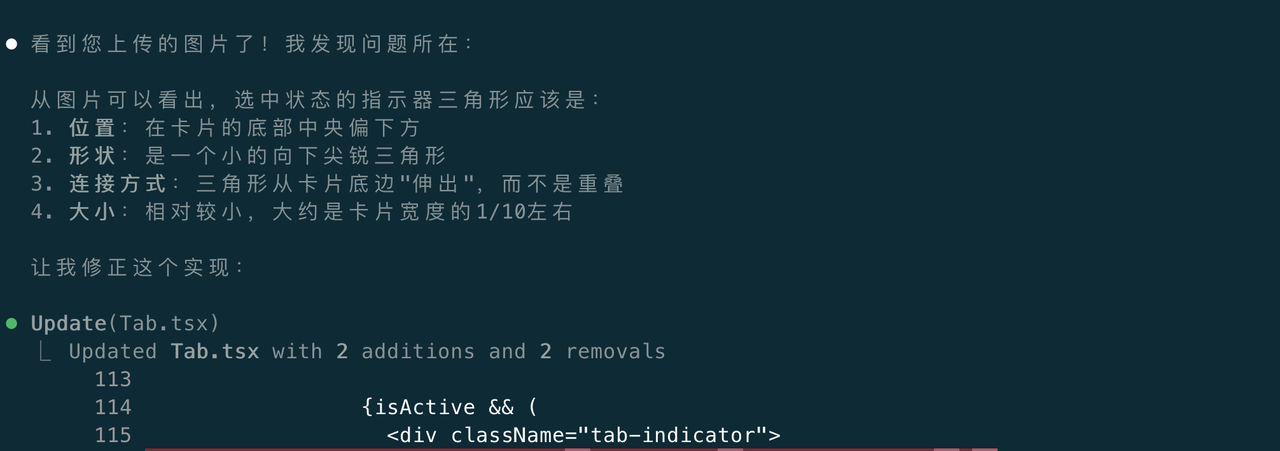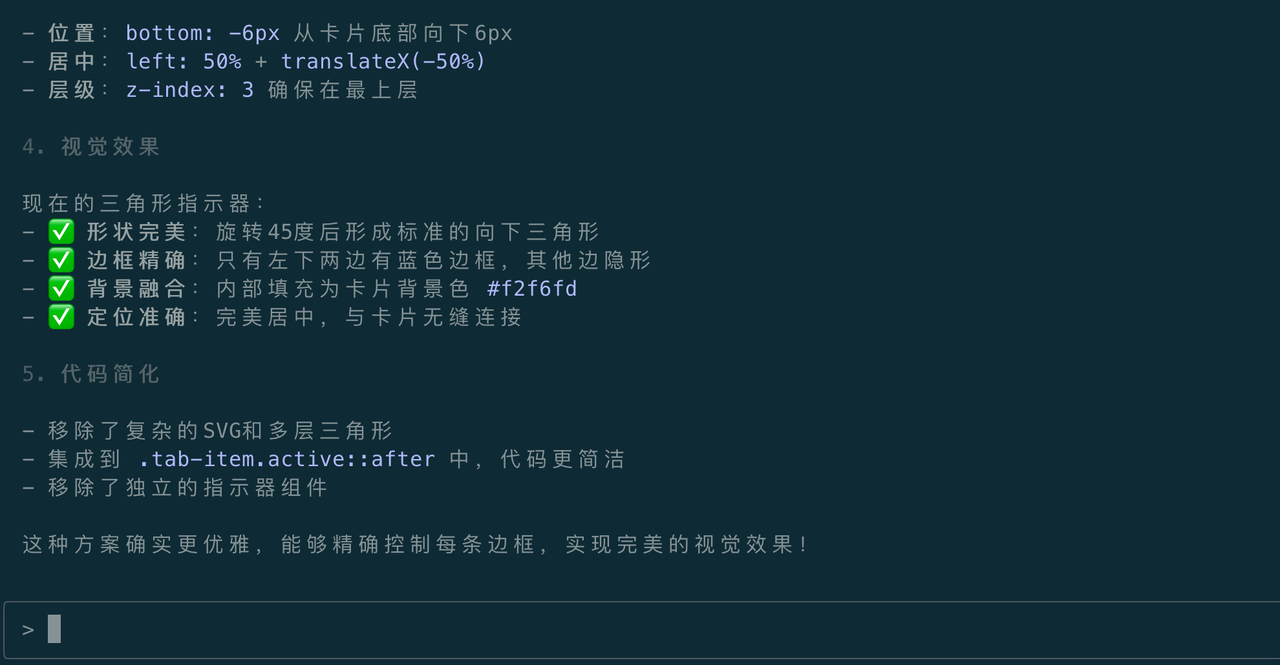 由于Claude Code使用的svg实现指示器的小三角形的,逻辑相对麻烦,所以这里修改次数多了一些,这次效果还是不好,我让他改成css实现三角形效果