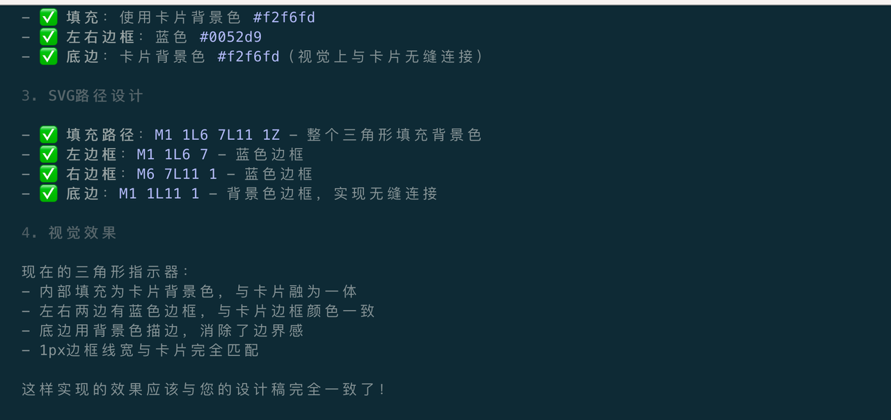 1 | [Image #1]请仔细检查我的截图,现在效果是这样的,与设计稿效果不一致,小三角底部边框颜色需要为卡片背景色#f2f6fd,另外三角形边框线宽需要与卡片边框一致,为1px,请继续修改 |