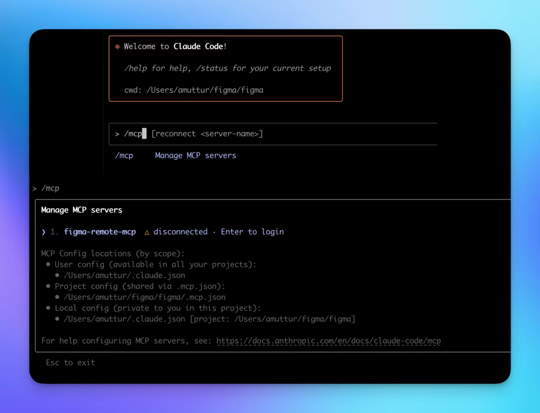 然后输入 /mcp 命令,选择Manage MCP servers命令,然后可以看到所有可用的工具,选择figma-remote-mcp后回车,会打开Figma网站链接账号授权,同意即可成功后就可以正常连接了